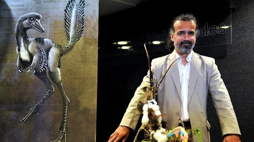 El paleontólogo Sebastián Apesteguía presentó a “Alnashetri cerropoliciensis”, un animal carnívoro con pico y plumas que vivió hace 95 millones de años y fue hallado en el yacimiento La Buitrera, en Río Negro.