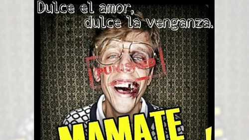 La campaña publicitaria llevaba el texto "Mamate y pegale a tu ex!!! Dulce es la noche, dulce la venganza" sobre la imagen de un joven con vendajes de boxeo ensangrentados, y daños maquillados en su cara.