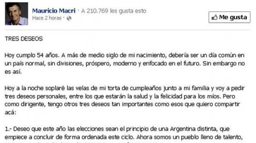 El alcalde de la Ciudad de Buenos Aires, Mauricio Macri, cumple este viernes 54 años y decidió publicar en su cuenta de Facebook los deseos que tiene "como dirigente" para este año.
