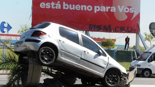 Un insólito accidente ocurrió este viernes sobre el puente Pueyrredón cuando un conductor perdió el control de su auto y el vehículo quedó montado sobra una palmera ubicada sobre un cantero.