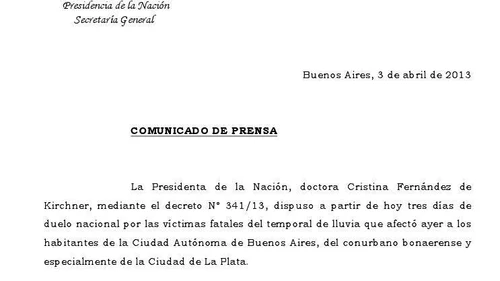 La Presidenta de la Nación, mediante el decreto 341/13, dispuso a partir de hoy tres días de duelo nacional por las víctimas fatales del temporal de lluvia que afectó ayer a los habitantes de la Ciudad Autónoma de Buenos Aires, del conurbano Bonaerense y especialmente de la Ciudad de La Plata.