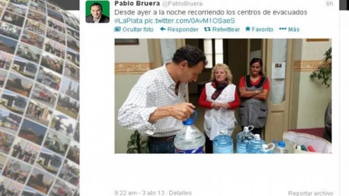La polémica se desató ayer cuando Bruera escribió en Twitter que estaba en La Plata y adjuntó una imagen donde se lo veía entregando bidones de agua junto con dos maestras en una escuela donde se filtraba la luz del día. La realidad es que se encontraba de vacaciones en Brasil. El viaje de Bruera pudo ser confirmado por distintos portales de noticias que informaron que el intendente arribó recién ayer, a las 9.25, al aeroparque metropolitano proveniente de Río de Janeiro.