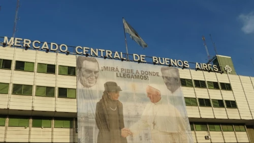 La imagen, que subsume el ideario político con la fe que profesa la mayor parte de los argentinos, fue ubicada en el edificio principal del Mercado Central, que da a la Autopista Richieri, por lo cual es observada a diario por miles de personas que transitan por esa arteria clave que comunica con la ciudad de Buenos Aires.