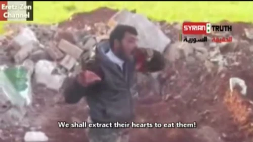 En el video, un hombre identificado como Abu Sakkar, que sería jefe de una brigada, aparece junto al cadáver de un soldado e insulta a los alauitas. Luego arranca el corazón del soldado con un cuchillo y se lo lleva a la boca.