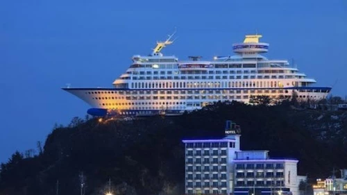 Aunque parezca un truco, esta imagen es verdadera y corresponde al Sun Cruise Resort, en Donghae, Corea del Sur, un hotel que ha sido diseñado y construido en un astillero exactamente como un transatlántico, permitiendo emular la experiencia de un crucero pero con su casco anclado a tierra, evitando así los mareos propios del mar.