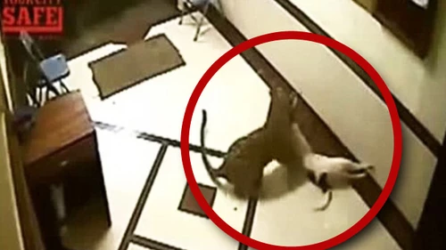 El video, de apenas 21 segundos que fue publicado por el sitio de Patryn World Latest News, muestra la rapidez y cuidado con que el gran felino atrapó al can.