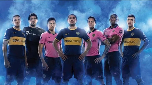En el centro de la foto oficial de la temporada 2013/2014 de la indumentaria xeneize está Juan Román Riquelme, con la tradicional Azul y Oro, al igual que Pablo Ledesma y Leandro Paredes. Con la versión rosa - que fue oficializada como alternativa por el club y la marca Nike - posaron Juan Sánchez Miño, Ribair Rodríguez y el Burrito Martínez. Agustín Orión lució el clásico buzo negro de arqueros.