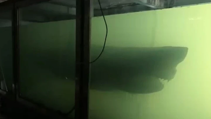 "El tiburón que se muestra es un gran tiburón blanco de 5 metros. Está muerto y es una pieza de taxidermia... Murió en 1998 en redes de pesca de atún en el sur de Australia. Se está conservando en este tanque en formol", explicó el joven que se hizo famoso a partir de este video.