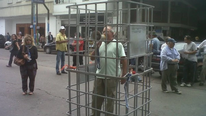 Un hombre se enjauló frente a los Tribunales de Quilmes para manifestarse en contra de una condena de dos años y seis meses de prisión que le aplicaron luego de instalarse frente a la casa de un joven que le había robado en cinco oportunidades.