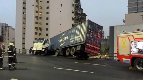 Llamados al complejo 911 durante la primera hora de la mañana derivaron en el desplazamiento de móviles de la Comisaría Vecinal 1 F y de la División Destacamentos y Autopistas de la Policía de la Ciudad hasta la autopista 25 de Mayo a la altura de la calle Perú, ya que un camión había quedado colgando de la autopista, con eventual peligro de caida.