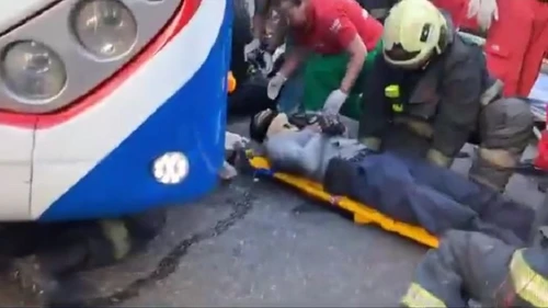 El motociclista quedó debajo del micro y fue rescatado por los Bomberos de la Ciudad. Está vivo de milagro.