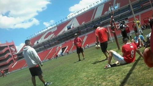 Después de comer y bajo el sol, jugaron al fútbol en el campo de juego del estadio, desplegaron algunas banderas y posaron para las fotos.