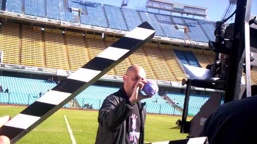 Rodeado de la tecnología 3D “casera” desarrollada por FDS exclusivamente en Argentina, el director se oculta detrás de una gran bola inflable tipo Quico. En realidad, esa esfera es el Rey Sol, que a esa hora del mediodía ya quemaba el césped del stage: la Bombonera.