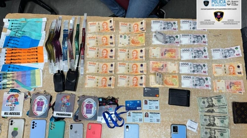 Entre los elementos se encontraron 8.500 pulseras de papel con numeración correlativa de diferentes colores y dibujos, 200 pulseras impresas de producción del evento, 250 códigos QR, 78 sujeta pulseras, 350 agarraderas plásticas con la inscripción "VIP", 110 dólares, 222.000 pesos, celulares, credenciales y una impresora térmica.