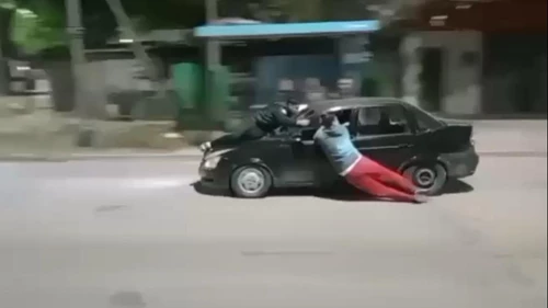 El conductor llevó a los manifestantes colgados de la puerta del vehículo y arriba del capot. En medio de un ataque de desesperación, una de las víctimas comenzó a golpearle el parabrisas para que frene.