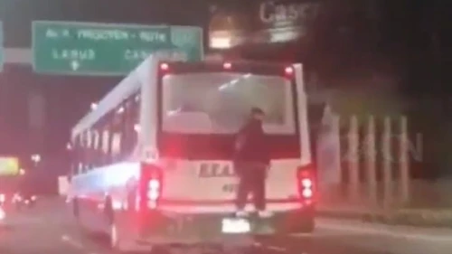 Un joven fue grabado mientras viajaba colgado en la parte de atrás de un colectivo en la bajada al puente Pueyrredón y las imágenes se viralizaron en las redes.