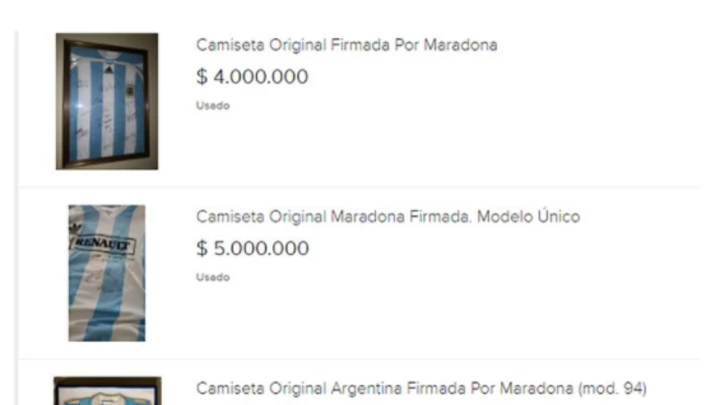 Otro vendedor ofrece una camiseta del partido homenaje a Maradona por $4,5 millones, en la que no ahorra pruebas de su autenticidad. "Se entrega con su respectiva certificación y legalización, mas un DVD que muestra el momento en que Diego la firma", advierte. En la foto, la camiseta está ubicada junto a un acta notarial.