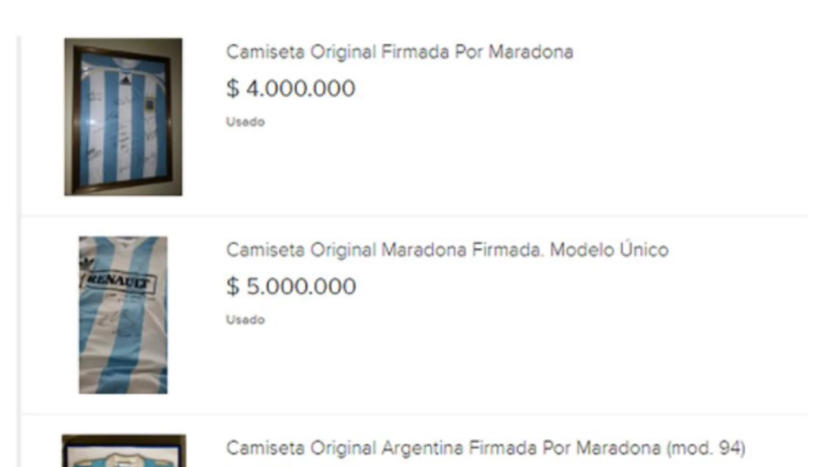En otros casos, los interesados deberán ser más confiados. La camiseta argentina con el logo de Renault, utilizada en aquel partido de 1990 en que Diego compartió la cancha con el ex presidente Carlos Menem, se ofrece con una firma acompañada por la frase "para un amigo, con afecto", junto a la firma más famosa de la Argentina, junto a un "(10)". El vendedor inicia la negociación con un "precio orientativo" de USD 30.000, aunque se publica con el valor de $5 millones.