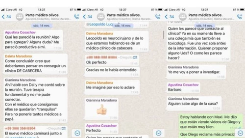A juzgar por las capturas de las conversaciones que todos mantenían, la principal preocupación era la de encontrar un médico clínico que pudiera atender al astro argentino. "Luque es neurocirujano, deberíamos pensar en un médico clínico de cabecera", se lee en uno de los mensajes enviados por Dalma y Gianinna responde: "Con el médico que consigamos ellos [aparentemente por la clínica Olivos] se quedarían tranquilos, para no ponerle tantos médicos a papá".