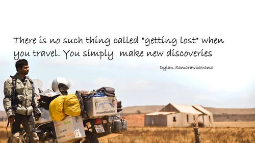 “Ahora soy un hombre grande, mi situación ha cambiado. Estaba viviendo en Suiza y tenía mi propio taller de reparación y mantenimiento de automóviles. Con los años he tenido la oportunidad de explorar diferentes partes del mundo en motocicletas. Pero la idea de ver todo el mundo en un viaje nunca se fue de mi mente. El gran día se arrastró sobre mí como un ladrón en la noche, fue una decisión espontánea. Me fui de casa pensando que volvería en dos meses. Mi nombre es Dylan Samarwickrama. Para alguien que no está familiarizado con Sri Lanka , mi apellido es un trabalenguas . Durante varios años he luchado para llegar a un acuerdo con ese nombre largo. Fue simplemente porque vivir en Europa con un nombre como Samarawickrama hizo las cosas muy difíciles. Pero entonces un día alguien me preguntó: ¿Hay un significado detrás de ese nombre? ¡Claro! Al traducir al inglés significa literalmente "celebrante de la aventura ". Para ser honesto, hasta ese día nunca había pensado en eso. Nunca me llamó la atención. ¡Soy un aventurero! No sólo por el hecho, sino también por el nombre”, finalizó Dylan.
