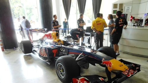 Como entrada, los técnicos de la escudería, acompañados por el piloto, encendieron el motor del RB7 en un restaurant de Barrio Norte: