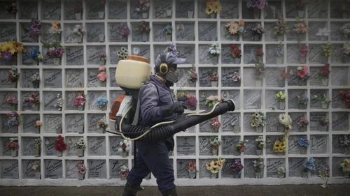 Un trabajador del cementerio fumiga nichos dentro del cementerio de Nuestra Señora de Belén como medida preventiva en medio de la pandemia de Covid-19 en Fusagasugá, Colombia.