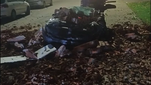 La mampostería de un edificio de la localidad de Garín se desplomó, cayó sobre dos autos que se encontraban estacionados y los aplastó.