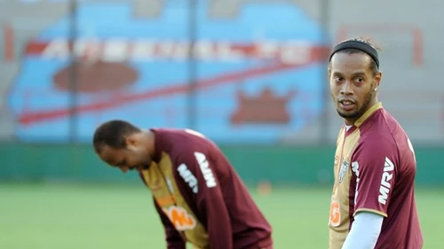 El astro brasileño Ronaldinho participó esta tarde de una práctica con su equipo, el Atlético Mineiro, en el estadio de Arsenal de Sarandí, en la previa del partido que ambos equipos disputarán mañana a las 21.30 por el Grupo 3, en la fase inicial de la Copa Libertadores de América.
