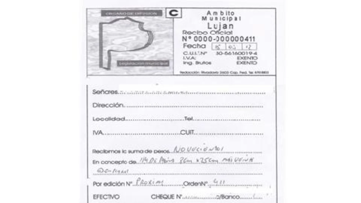 Los vendedores presentan a los comerciantes un recibo que contiene un logo con el mapa de la provincia de Buenos Aires y dice Órgano de Difusión- Legislación Municipal.