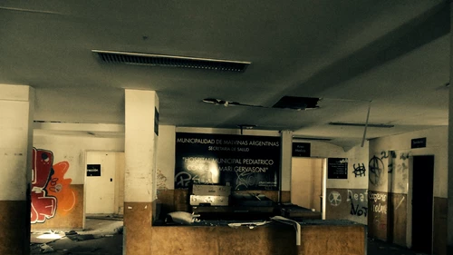 La puerta frontal está tapiada con una madera. Los vidrios rotos de las ventanas permiten que ingresen al lugar los chicos cuando salen de la escuela. Uno de los accesos, se encuentra firmemente atado con una manguera. El piso está tapizado de papeles: viejas fichas médicas, fotocopias de documentos y folletos sanitarios que se mezclan con algunas cajas de vino, botellas de fernet y hasta una vacuna contra la polio. El lugar parece haber sido abandonado de emergencia. Los carteles que todavía cuelgan de las paredes anuncian las distintas áreas. En el hueco del ascensor, trabado entre dos pisos, descansa un carro para llevar la comida. En el primer piso, las paredes pintadas con mariposas están descascaradas y un pote de alcohol en gel sobrevivió a la ola de robos. Los vidrios rotos esparcidos por el piso y las paredes pintadas con aerosol conforman un cuadro tétrico, ideal para ambientar una película de terror.