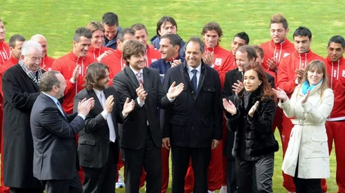La Presidenta Cristina Kirchner recordó las palabras del Papa Francisco en Brasil al inaugurar el nuevo estadio del club Deportivo Morón. La acompañan el gobernador Daniel Scioli y el primer candidato a diputado nacional del Frente para la Victoria, Martín Insaurralde.