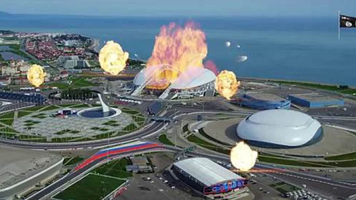 La secuencia empieza con un drone que tiene la bandera negra del Estado Islámico pintada. Sale de un lugar cerrado y luego aparece sobrevolando el Estadio Olímpico de Sochi.