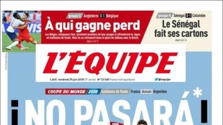 Todo lo que parece contagiar el entrenador es bajado en esa misma línea por la prensa francesa. Ahí se encuentra como máximo paradigma al diario deportivo L'Equipe, que eligió hacer su tapa no con alguna o varias de sus estrellas ofensivas, sino con Messi rodeado por cinco camisetas azules (Pogba, Pavard, Umtiti, Varane y Kante) y con un título en español: "No pasará".