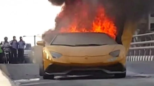 En Dubai, el dueño de este vehículo le dio con todo, hasta el fondo, durante un rato largo mientras otro lo filmaba adelante. Y pasó lo que pasó: el motor recalentó, se produjo una explosión y el Lambo terminó prendido fuego.