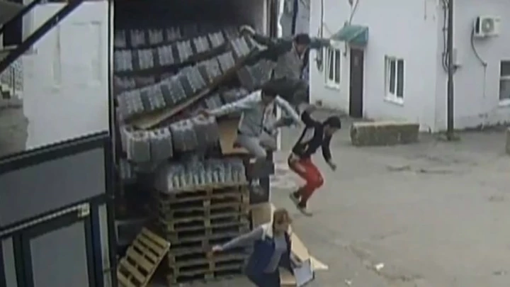 Un grupo de trabajadores rusos se salvó de milagro tras protagonizar un desafortunado accidente. Todo ocurrió cuando descargaban un camión repleto de botellas y, tras una mala maniobra, todo se vino abajo.