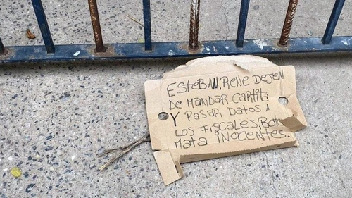 "Esteban, René, deja de mandar cartita y pasar datos a los fiscales, botón, mata inocentes", señalaba el cartel, en referencia a Esteban Alvarado y René Ungaro, ambos rivales directos de Los Monos en la disputa territorial.