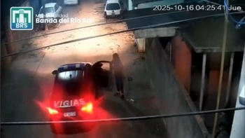 El ladrón intentó doblar la puerta del conductor con la ayuda del destornillador sin saber que estaba siendo registrado por el Centro de Monitoreo de Banda del Río Salí.