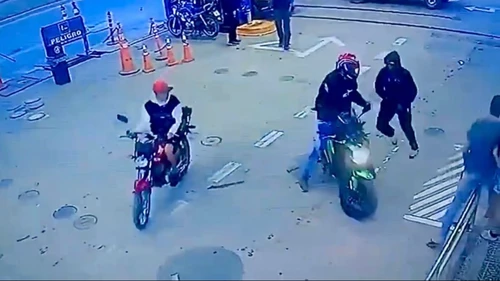 Las cámaras de seguridad del lugar registraron el momento en que uno de los ladrones descendió de la moto, realizó gestos amenazantes como si portara armas y obligó al motociclista a abandonar su rodado.