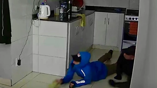Ya dentro del domicilio, los ladrones se arrastraron por el piso para evitar ser vistos. Lo que no sabían es que había una cámara dentro de la cocina que registró todos sus movimientos.
