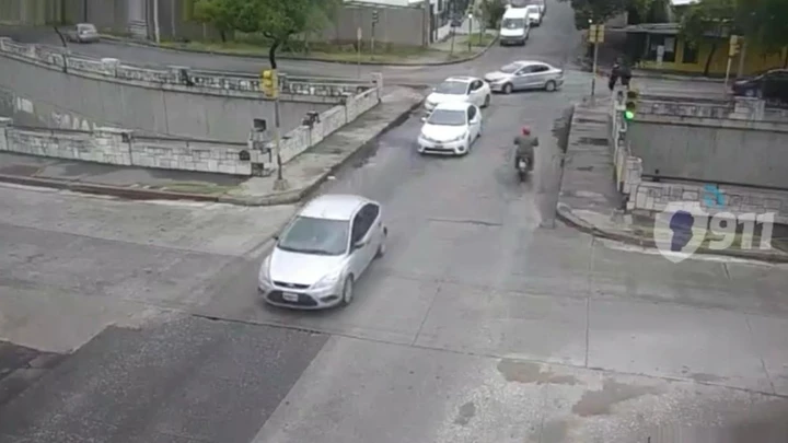 Uno de los delincuentes se acercó al auto mientras se encontraba detenido por el semáforo en rojo, metió la mano por la ventanilla pero falló y escapó caminando como si nada hubiera pasado.