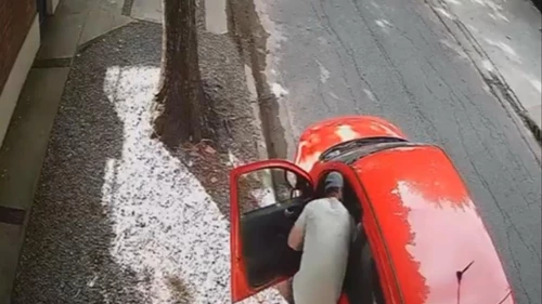 Una cámara de seguridad registró el momento en el cual la víctima se sube a su coche. El agresor, que venía caminando con unas cajas por la misma vereda, la abrió de forma intempestiva el auto y la encañonó.