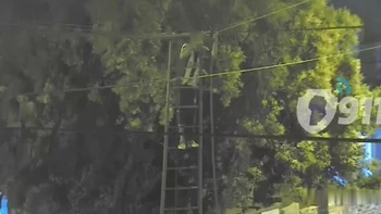 Las cámaras del 911 captaron el momento en el que dos hombres levantaron una escalera en la esquina de Guillermo Miller y Abramo. Una vez arriba, uno de ellos sacó un cuchillo estilo tramontina con el que comenzó a cortar la fibra óptica.