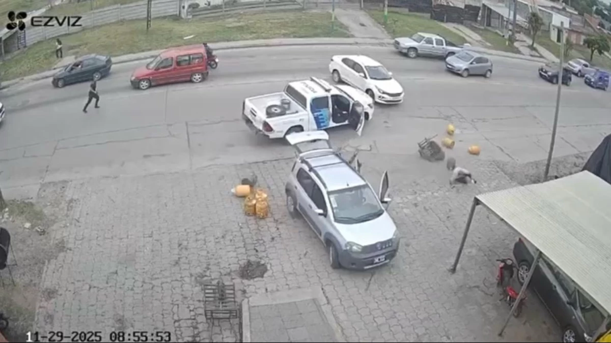 Minutos después, el Cronos fue detectado por cámaras del COM y móviles del Comando de Patrullas. Durante la persecución, en Antártida Argentina y Mario Bravo, el conductor realizó una maniobra evasiva marcha atrás, cruzó de carril, subió a la vereda y embistió a dos hombres —de 30 y 57 años— que trasladaban garrafas, provocándoles heridas de gravedad antes de seguir la fuga.