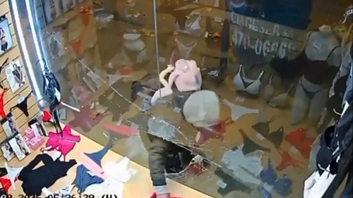 Sin perder tiempo, se introdujo por el hueco del vidrio y se llevó todos los conjuntos de ropa interior que pudo, mientras la alarma del local sonaba con fuerza.