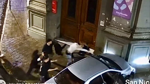 Tal como quedó registrado en las cámaras, el rodado casi impactó contra un auto rojo que logró evadirlo. Lo que no pudo evitarse fue la feroz golpiza entre los jóvenes que estaban a bordo del vehículo y quienes estaban apostados en la vereda del edificio chocado.