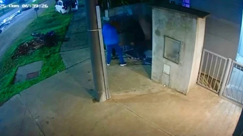 El golpe fue registrado por las cámaras de seguridad, y en las imágenes se observa a al menos cuatro ladrones cargando una bóveda pesada en un auto estacionado sobre la vereda, donde un cómplice los esperaba con el baúl abierto.