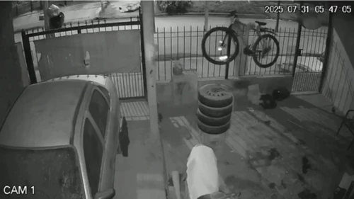 Las cámaras de una casa ubicada en la calle Mozart, en Merlo, tomaron el momento exacto dónde un ladrón saltó las rejas para llevarse una bicicleta apostada cerca de la puerta.