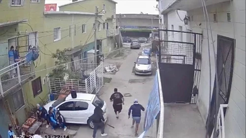 En las imágenes de cámaras de seguridad se observa a varios simpatizantes que se refugian detrás de un auto mientras se escucha una ráfaga de disparos.