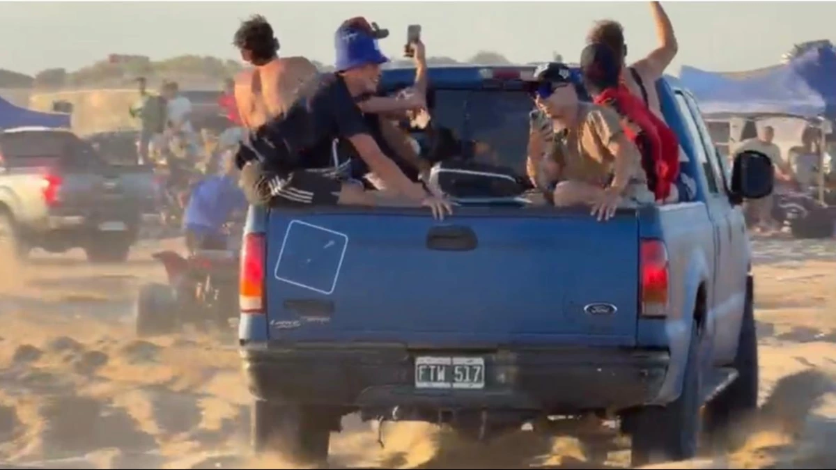 Las imágenes también muestran la ausencia de controles en la playa y la circulación simultánea de distintos tipos de vehículos en espacios abiertos, sin delimitaciones claras. En la caja de una camioneta viajaban al menos siete jóvenes que celebraban y alentaban las maniobras riesgosas.