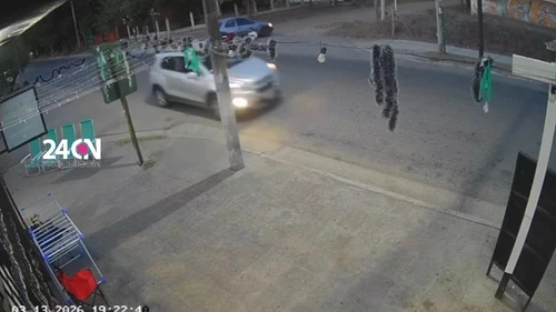 Según se observa en imágenes captadas por cámaras de seguridad de la zona, el conductor del rodado menor no llegó a frenar e impactó contra la puerta del acompañante del auto, tras lo cual salió despedido y cayó pesadamente sobre el asfalto.